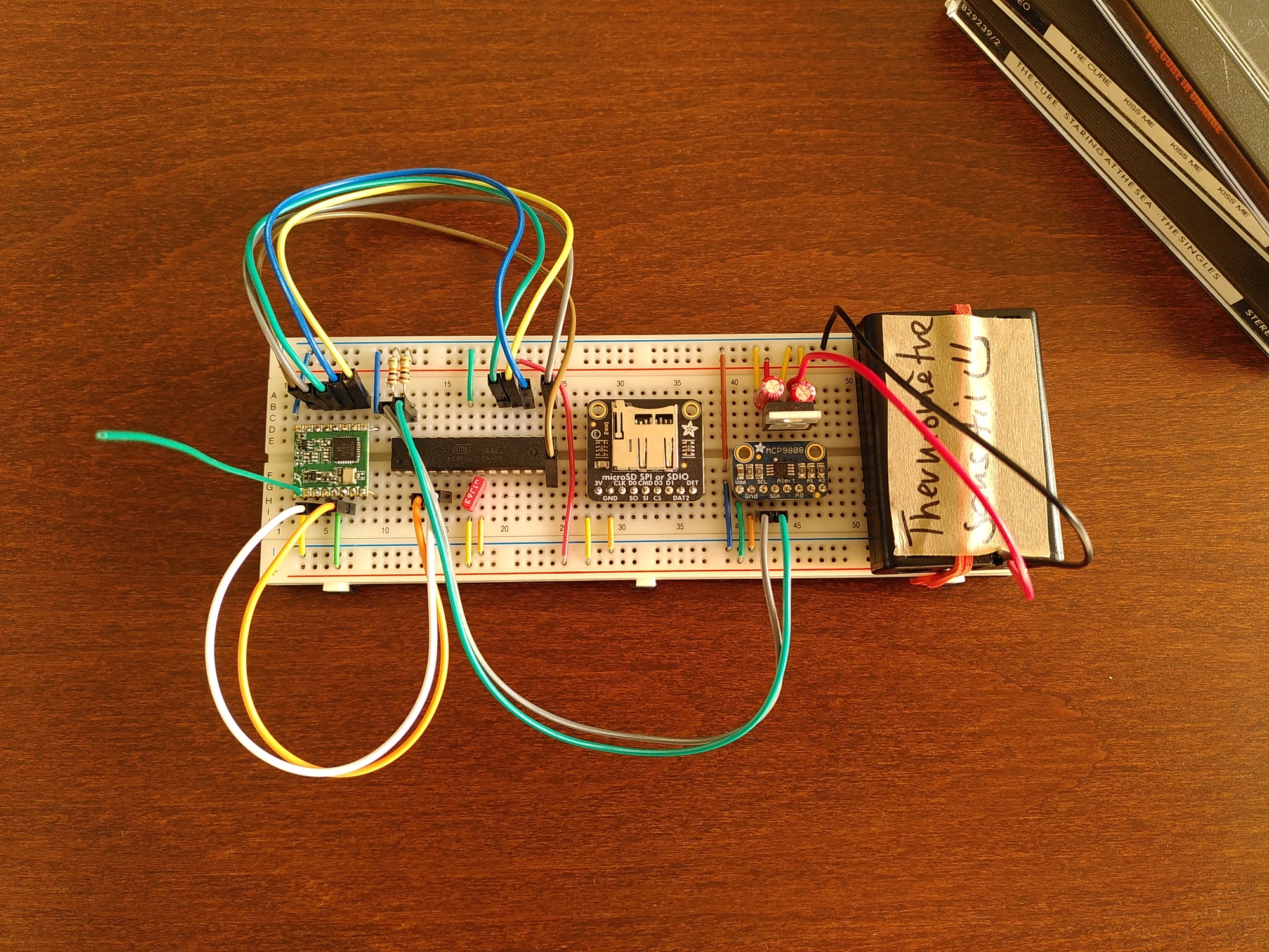 To save battery power, the controller, radio module and temperature sensor are put to power down/sleep mode in between transmissions.