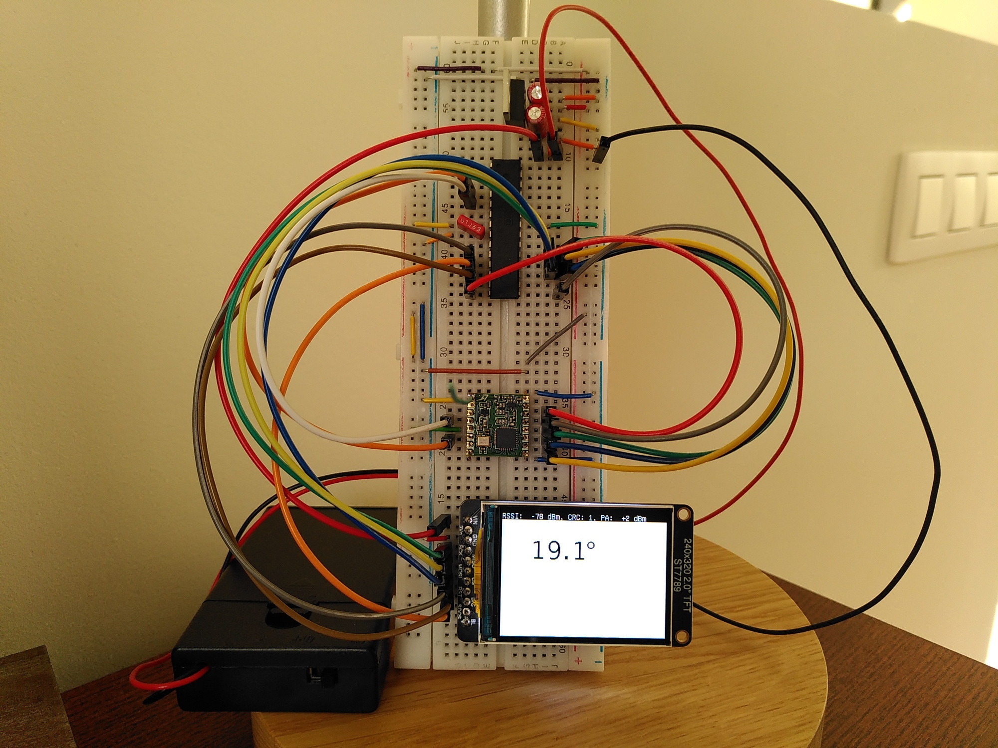 The receiver currently converts the raw temperature reading to °C and displays it with the RSSI value, CRC result and transmitter